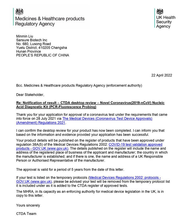 新冠檢測試劑在英國上市必須經(jīng)過CTDA審查和MHRA注冊雙認(rèn)證,由于CTDA審查對產(chǎn)品性能的高要求,目前可在英國合法銷售的新冠產(chǎn)品并不多。圣湘生物新型冠狀病毒(2019-nCoV)核酸檢測試劑盒(熒光PCR法)臨床性能和分析性能均滿足CTDA高要求,且得到進一步有效驗證,獲得了CTDA的充分認(rèn)可。