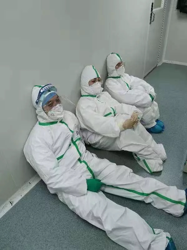 在武漢某醫院安裝儀器完工后,三名同事坐在醫院走廊地上休息。