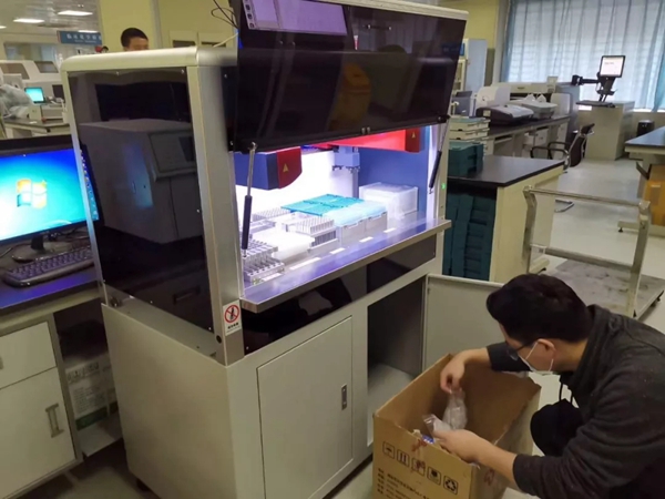 圣湘生物捐贈的第一批醫療設備、試劑以及配套耗材,順利抵達武漢。與當地合作商一起,裝運貨物入庫。